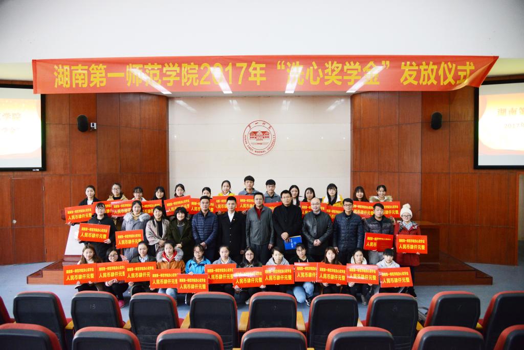 长沙洗心基金会办公室谭锷泉先生、谭志强先生和谭雪婷女士,我校校友会(基金会)秘书长邓朝晖、学生工作处副处长欧阳伶俐、各学院学工办主任、资助专干以及我校荣获2017年度“洗心奖学金”的30名学生和学生代表参加颁奖仪式。
