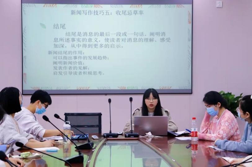 (熊薇 曾匡玲 胡轶帆)4月14日中午,我校易班学生工作站新闻组诚邀19级800中文班吴星可在玉衡楼201分享新闻写作经验,新闻组全体成员以及40余名新闻写作爱好者参与了此次分享会。