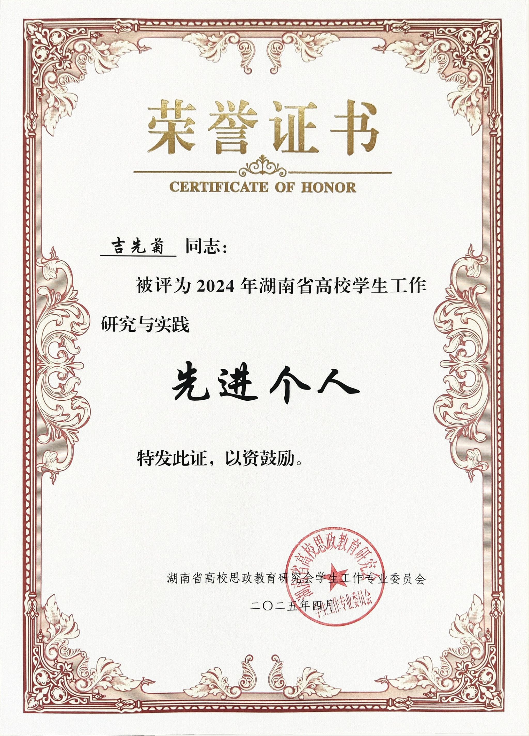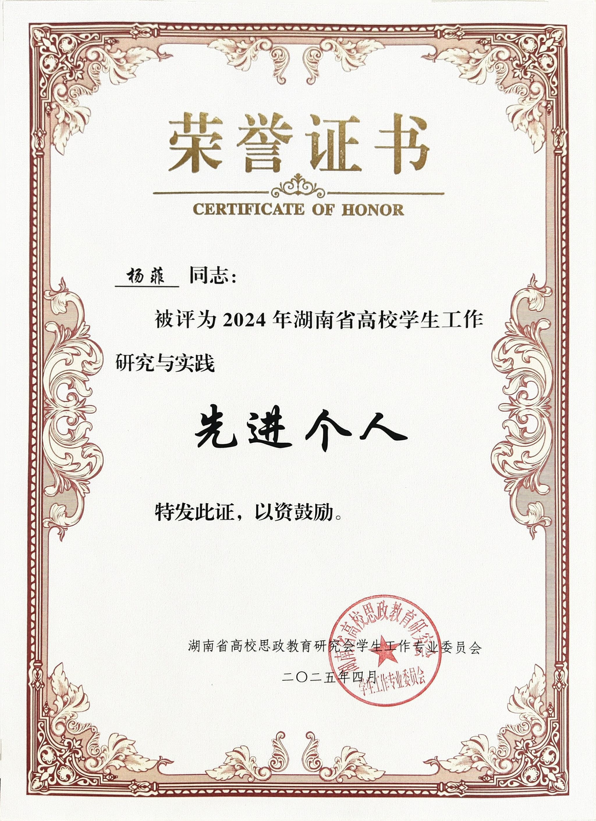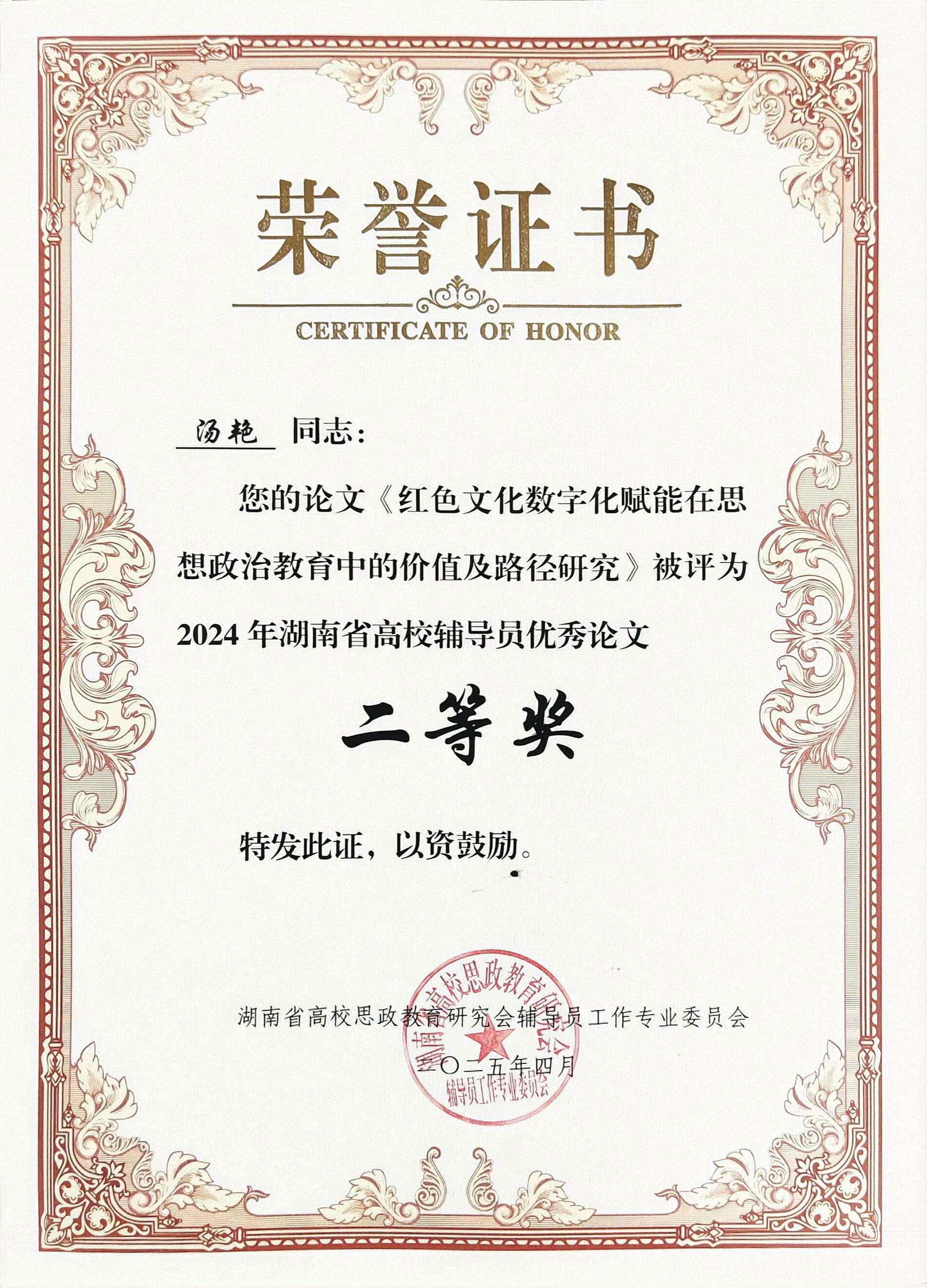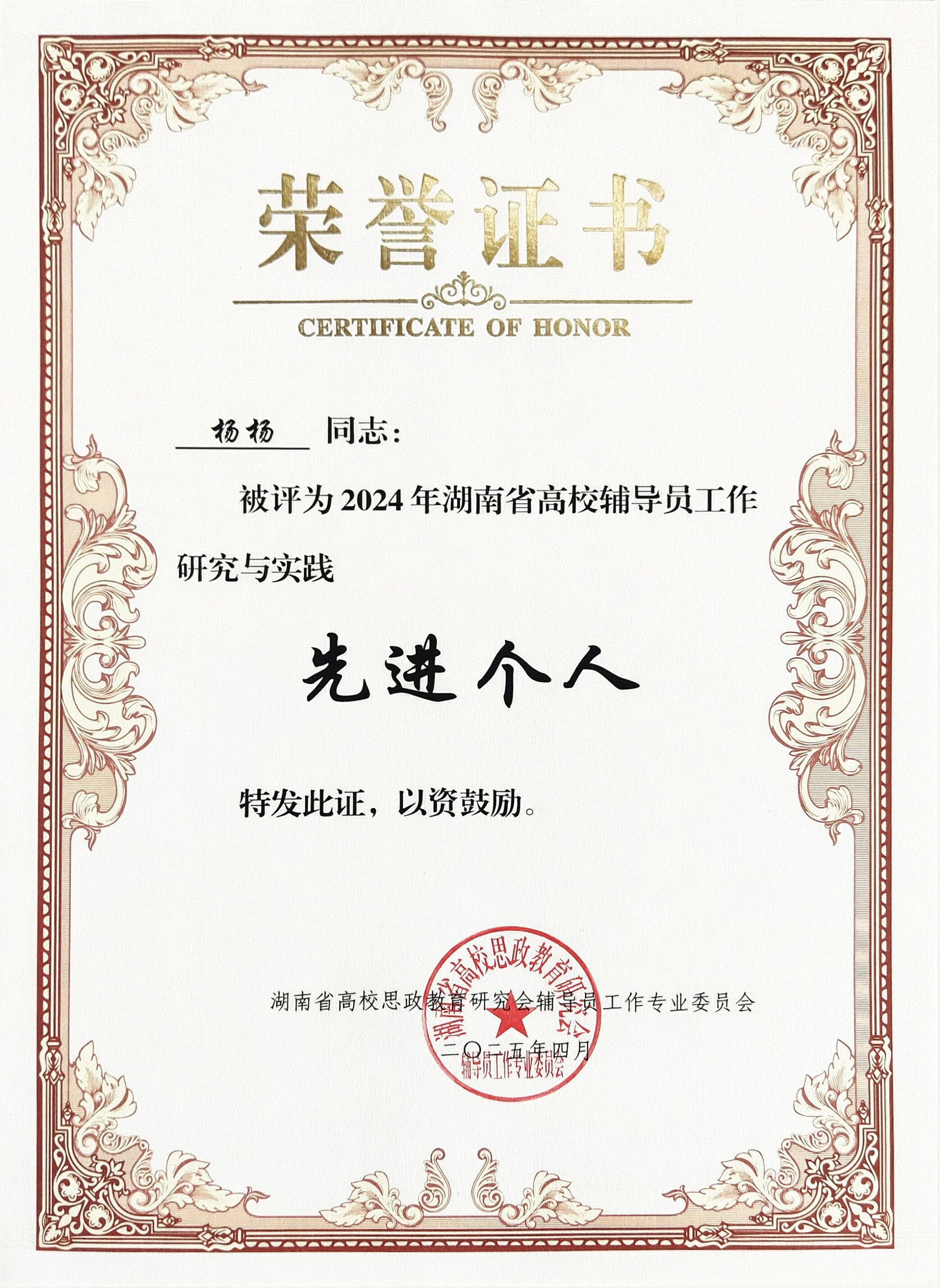 4月25日,湖南省高校思想政治教育研究会辅导员工作专业委员会、学生工作专业委员会2024年年会在湖南科技大学召开,会上隆重表彰全省先进单位及个人。我校凭借在学生工作领域的突出表现,荣获2024年湖南省高校学生工作研究与实践先进单位。教育学院杨杨、初等教育学院于智鹏获评2024年湖南省高校辅导员工作研究与实践先进个人,教育学院杨菲、数学与统计学院吉先菊获评2024年湖南省高校学生工作研究与实践先进个人。计算机学院汤艳的论文《红色文化数字化赋能在思想政治教育中的价值及路径研究》获2024年湖南省高校辅导员优秀论文二等奖。