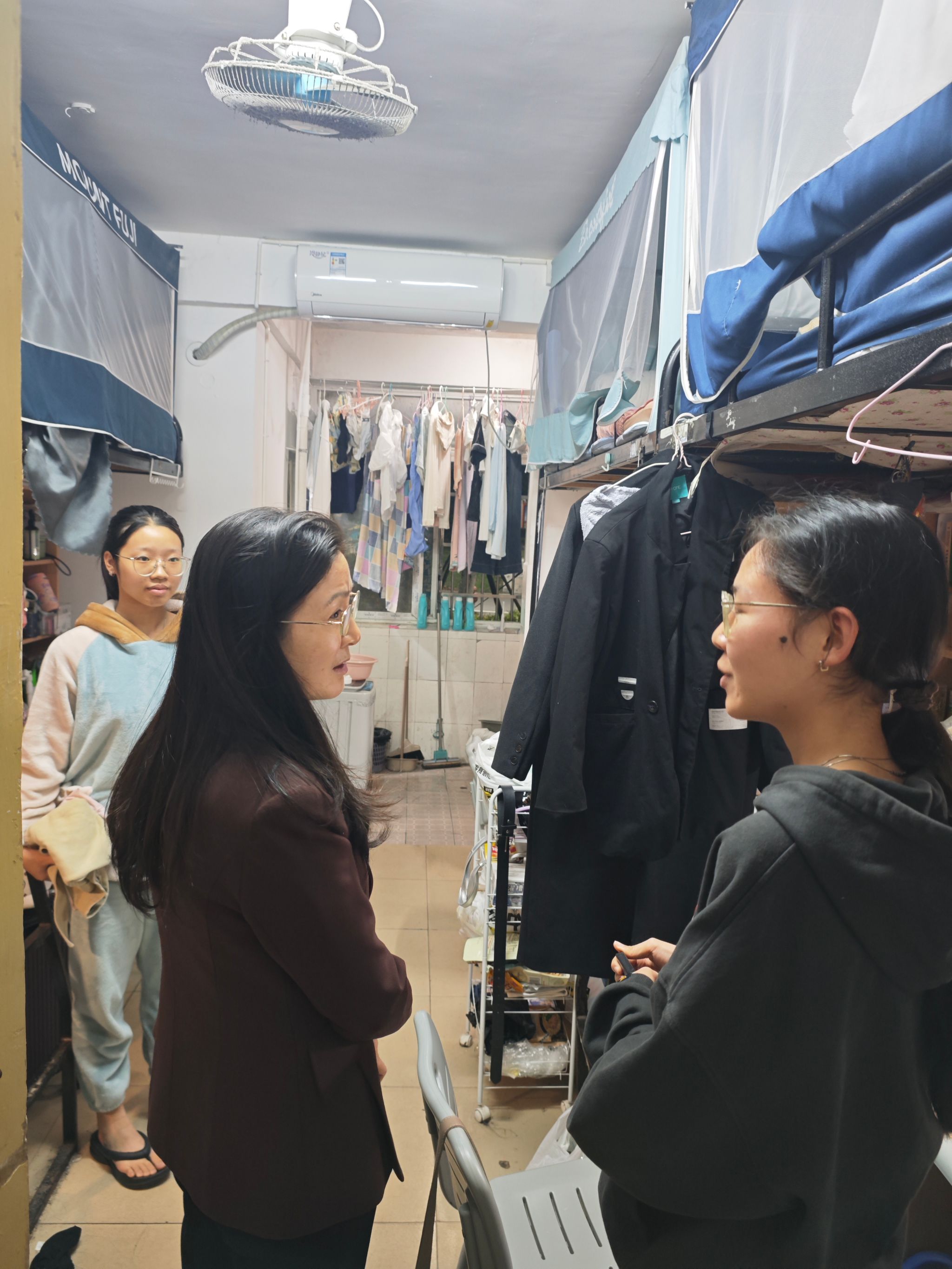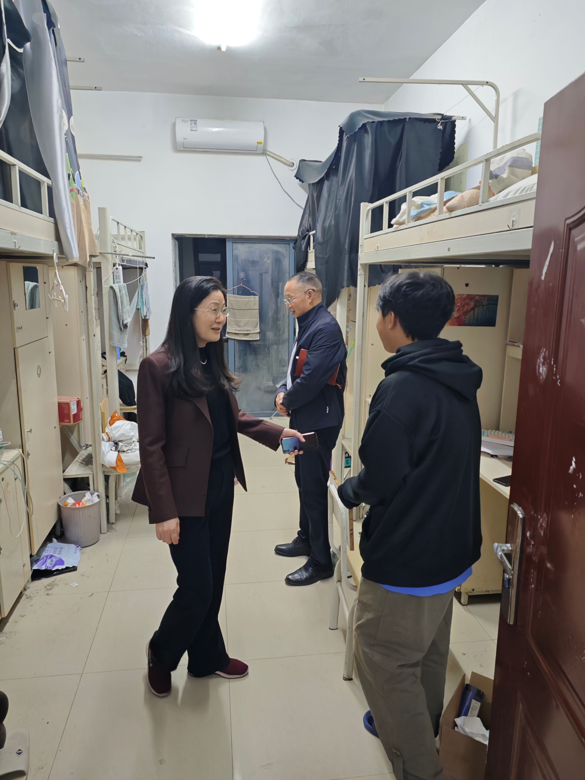 在走访过程中,蒋校长详细询问了同学们的学习与生活情况,检查了宿舍的卫生状况和基础生活设施,并对宿舍的管理情况进行了了解。她特别强调引导同学们养成7-9点自主学习习惯的重要性,并要求要加强学生教学技能的基础训练,对学生寝室的管理要体现在日常细节中,如寝室门贴等。