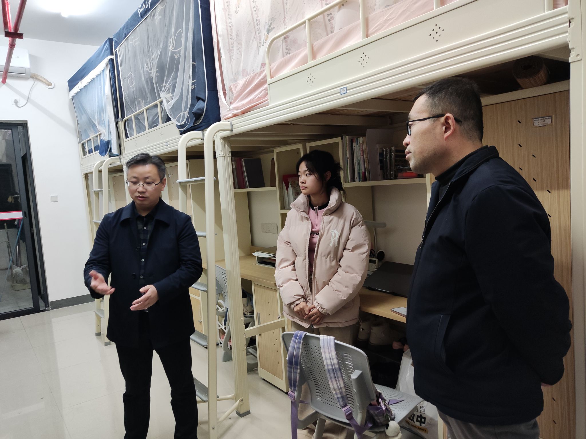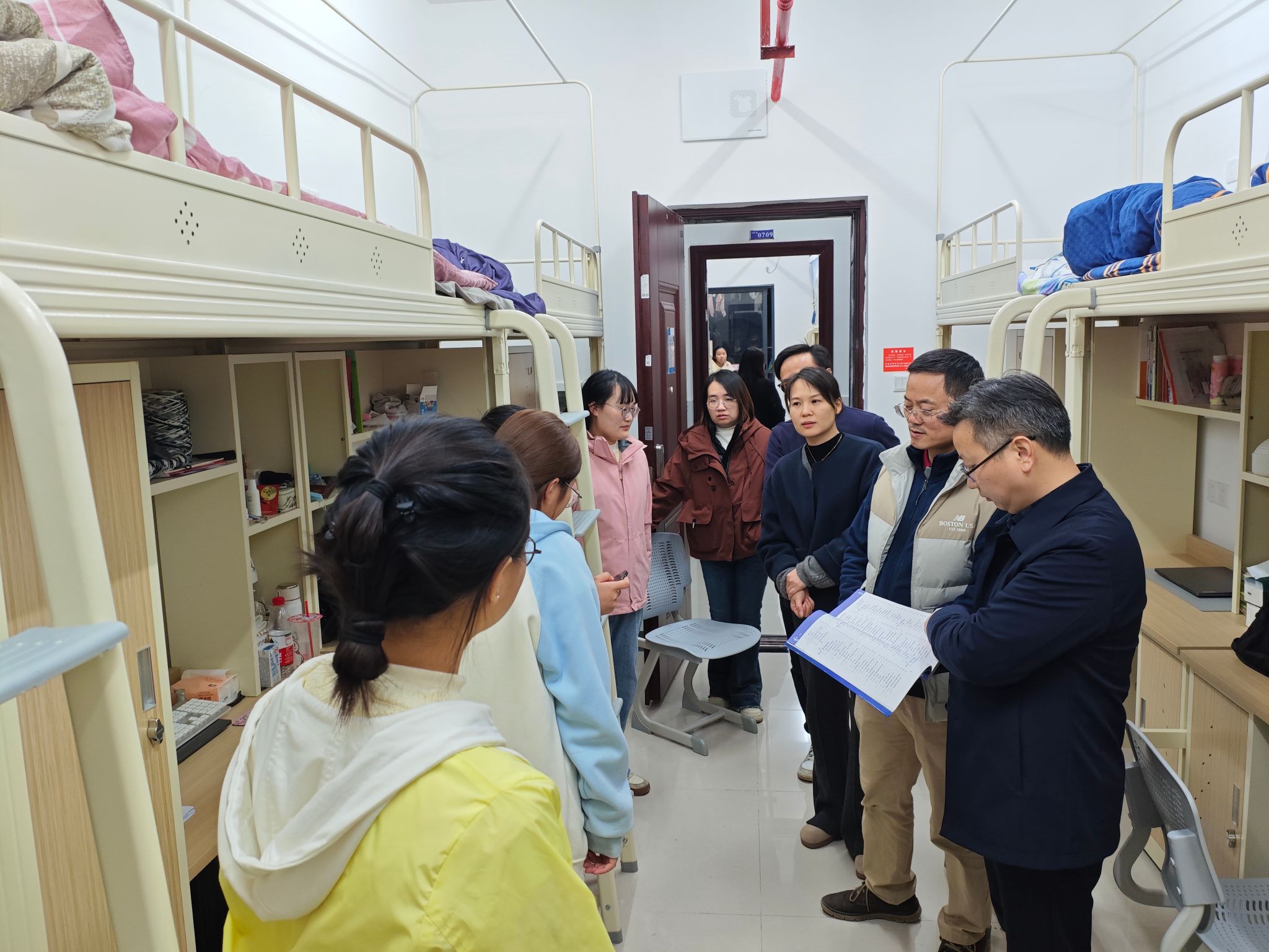 在18栋学生公寓,石校长查看了宿舍环境,关心同学们的日常生活,叮嘱大家要注意保暖和用电安全。并深入了解学生的专业课程学习、收获体会、有何困难等方面情况,鼓励大家认真学习,不断提升自我。