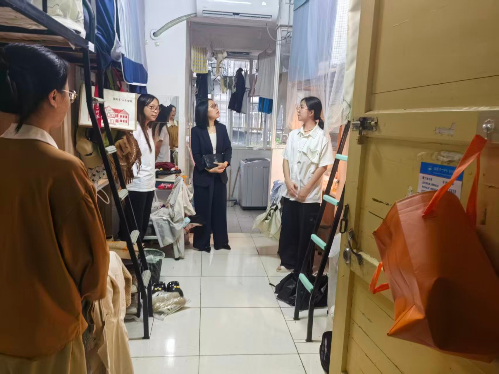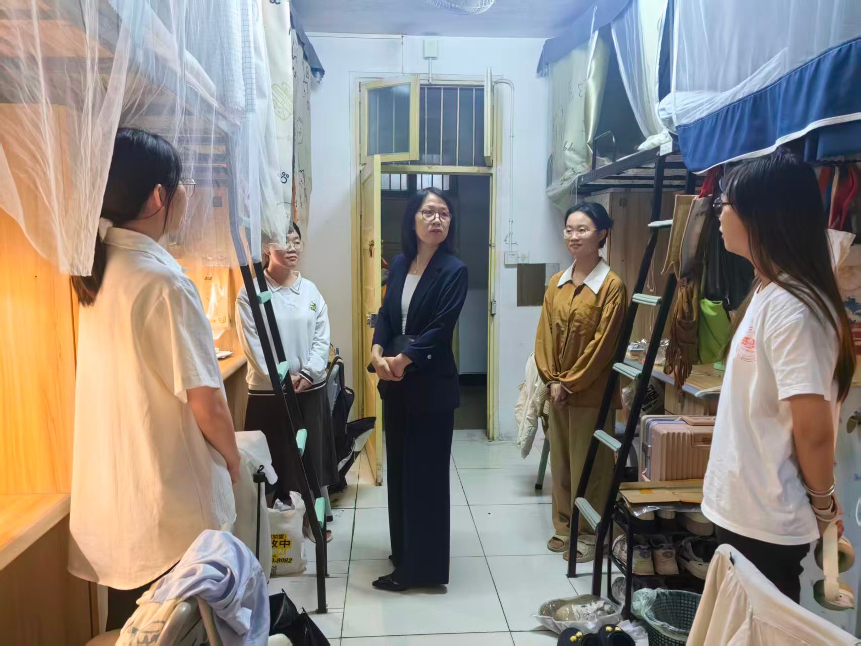"来自哪里?""学习生活上还有什么困难?"每走进一间寝室,刘丽群副校长都亲切地与同学们拉起家常。她细心查看空调、风扇及寝室干净、整洁情况,并对1栋308室物品分类整齐表示赞赏,耐心聆听同学们对寝室条件的反馈。从课程设置到食堂伙食,从考研规划到职业发展,刘副校长与同学们展开了深入而轻松的交流。她认真听取同学们的回答,并鼓励大家要珍惜同窗情谊,互帮互助,共同营造整洁、文明、奋进的寝室文化氛围。
