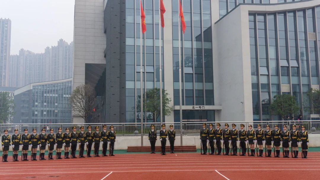 伴随着激昂乐章,国旗护卫队步伐铿锵,昂首挺胸地走向升旗台。国歌声中,鲜艳的五星红旗在晨光中缓缓升起,全体师生肃立凝视,心中激荡着对祖国的深情厚谊与无限自豪。