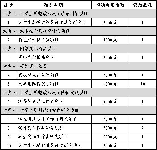 本次申报的项目共6大类,具体类别、单项资助金额及资助数量如下: