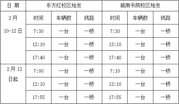 1.早上从东方红校区开往城南书院校区的班车6:55在校内教工食堂门口发车,7:00从校门口出发。