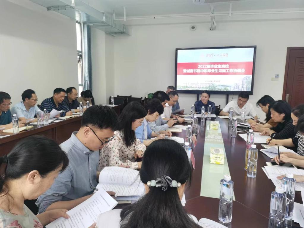 (付淑敏)5月30日下午,我校2022届毕业生离校暨城南书院中职毕业生见面工作协调会在百熙楼702会议室召开。校长童小娇、校党委委员、副校长周发明出席,相关职能部门负责人、各二级学院党委副书记、保利天创物业公司负责人参加,会议由校党委委员、副校长蒋蓉主持。