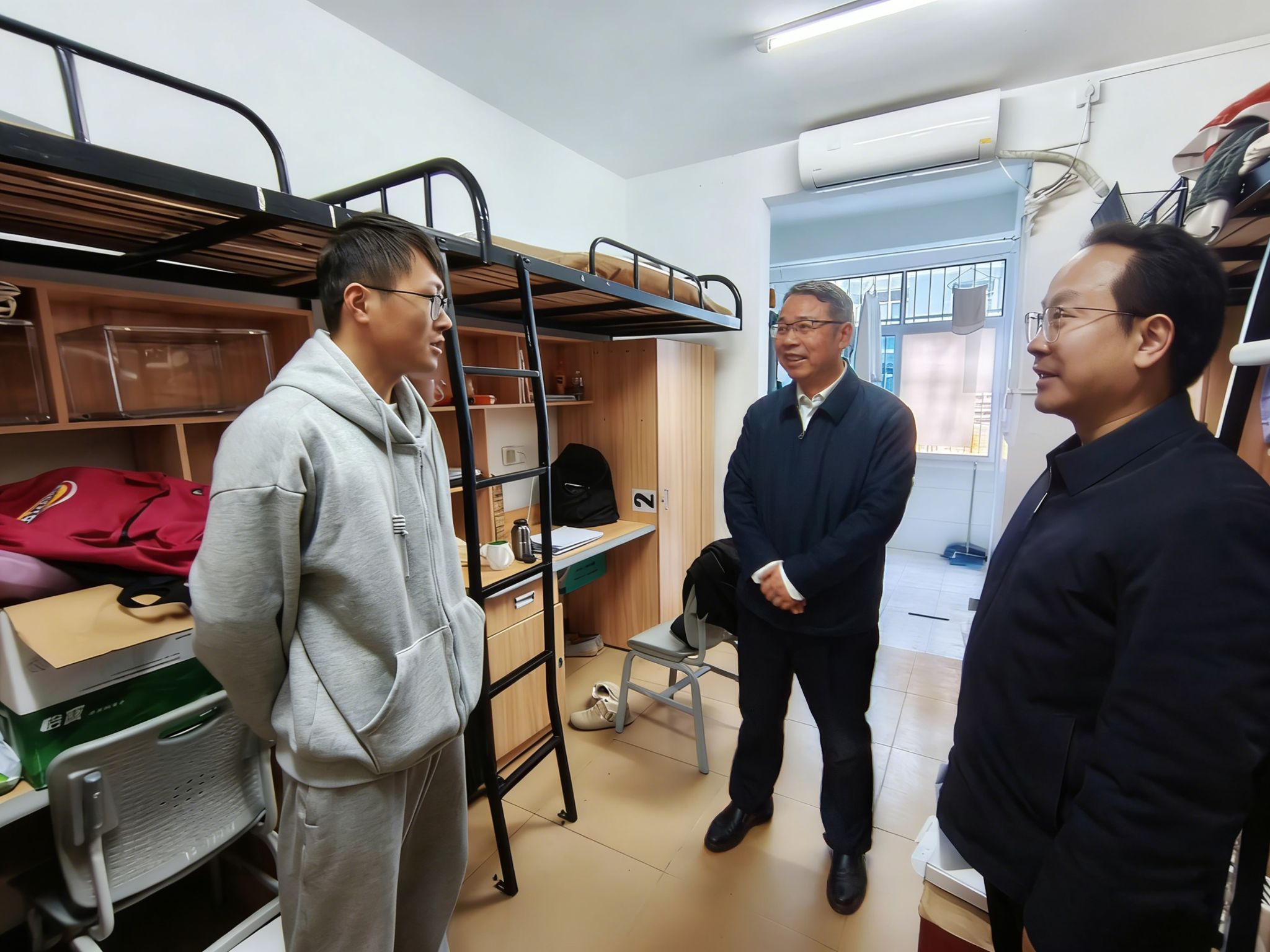 随后,彭晓辉前往学生公寓,检查水电、消防、人脸识别系统等设施,探讨公寓信息化系统提质升级的可行性,形成“人防”+“技防”双推进局面,以学生需求为导向,提升公寓管理智能化水平。深入学生寝室询问学生学习生活情况,听取了学生们对学校的意见和建议。在一站式学生社区活动室,他查看设施配备与活动开展情况,指出要立足“三全育人”理念,推动“一站式学生社区”综合管理模式建设,完善功能配置、丰富活动形式,推动育人力量下沉,把社区建成重要育人阵地。