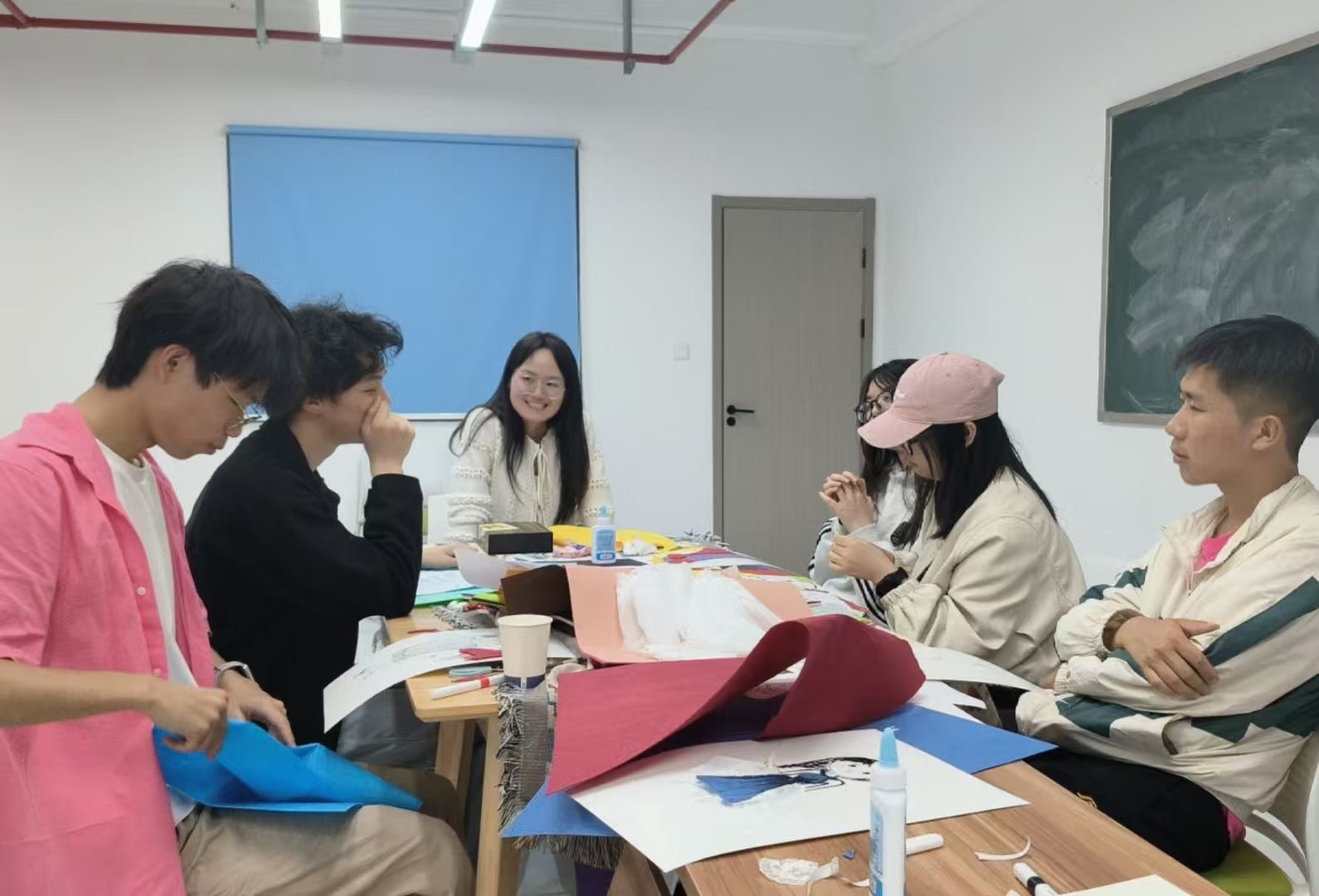 在自我探索与创作环节,同学们先为自己选定的角色赋予专属形容词,并在小组内交流分享;随后盲抽OH卡,结合卡牌意象重新定义贴合内心的形容词;最后以绘画、图片粘贴等形式,创作专属自我形象,将抽象的情绪与感受转化为具象的作品表达。
