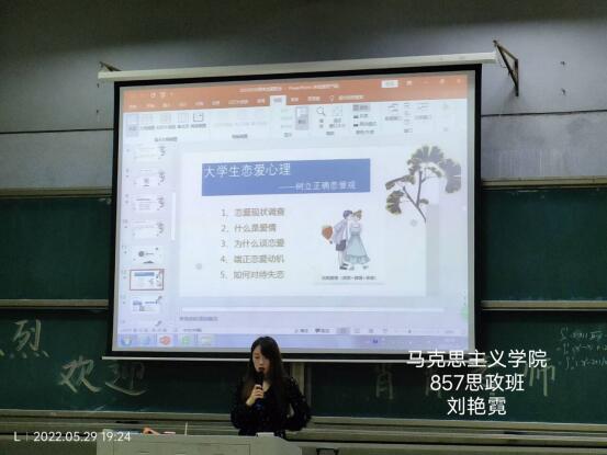 为了引导大学生形成正确的恋爱观,进一步为大学生排忧解难,各学院根据校校学生心理健康教育中心的要求精心准备、有些学院还制作了主题教育内容PPT,在5月29日晚开展了以“恋爱心理”为主题的周末主题班会。班会由各班辅导员主讲,全体学生参加本次班会。
