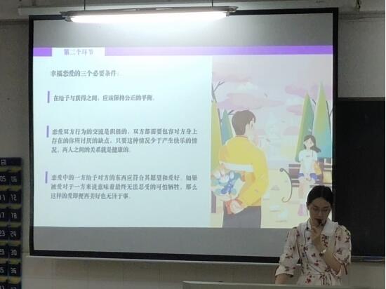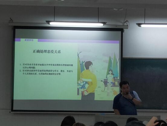 辅导员主要从“大学生恋爱的普遍原因”、“大学生恋爱的心理特点”、“大学生恋爱存在的问题”、“培养健康的恋爱心理与行为”“正确处理恋爱关系”“幸福恋爱的三个必要条件”等方面为学生们进行了讲解。