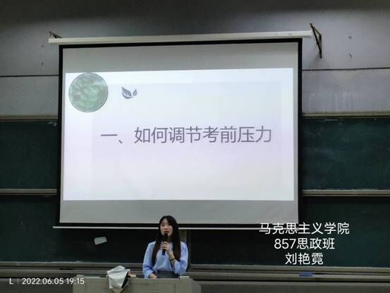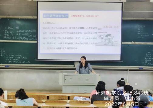 校学生心理健康教育中心为了配合学风建设、考风教育主题,建议各二级学院在6月5日周末主题班会开展过程中对全体学生进行“如何调节考前压力”心理知识普及。辅导员老师们根据校学生心理健康教育中心提供的相关资料进行细致准备:1.正视压力。俗话说:有了压力成动力,没有压力轻飘飘。心理学研究表明,适度的压力有利于学习效率的提高,而过高或过低的压力却不利于学习效率的提高。所以,压力本身并不可怕,很多时侯,人就是因为有压力而使自己的能力超常发挥。重要的是如何把压力调整到适度。