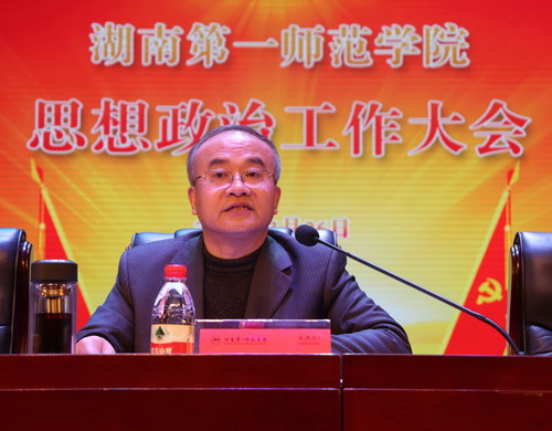 并从以下六个方面对2019年的学校思想政治工作提出了部署和要求:一是大力加强网络育人平台建设,切实推进大学生网络思想政治教育。全面推进“三全育人”综合改革试点项目、高校思想政治工作精品项目、研究项目以及高校思想政治骨干队伍建设项目的申报与建设工作;全面完成一、二、三周期大学生思想道德素质提升工程项目的验收评比,积极申报和建设省级、校级大学生思想道德素质提升工程相关项目;管理维护好“一师青年”“一师学生会”等“两微一端”公众平台,全面启动易班网建设,吸引凝聚学生受众,弘扬社会主义核心价值观,传播网络正能量。二是坚持育心与育德相结合,提高大学生心理健康水平 。全面构建 “五位一体”的心理健康教育工作格局,进一步完善和落实“五个早”预警机制和“五个一”危机干预机制;积极营造心理育人氛围,巩固“5•25”大学生心理健康节教育系列活动平台,开展心理健康教育系列讲座;完成“特色学生成长辅导室”及“心理沟通室”建设与验收。三是严格学生日常管理,促进校风学风班风建设。实行学风建设书记院长共同负责制,强化辅导员、班主任的教育管理责任与职能部门的统筹协调责任和学生的学习主体责任;定期召开学生意识形态工作研判会,及时掌握学生意识形态状况,做好相关工作;大力选树学生先进典型,开展三好学生、优秀学生干部、优秀毕业生的评选工作,立标杆、树典型,以榜样的力量促进学风建设;开展“寝室文化艺术节”,举办“综合型文明寝室”“党员先锋模范寝室”“优秀党团活动室”“公寓文明建设积极分子”“学生公寓管理实践代表”等创建评比活动,提升学生公寓的整体育人功能。四是优化整合实践育人资源,提高实践育人成效。不断创新志愿服务实践活动内容与形式,指导大学生志愿者广泛开展校内外志愿服务活动,搭建学校周边各街道、社区“区校共建”志愿服务平台,广泛开展敬爱助残、扶幼帮困、生态环保、信息宣讲等系列志愿实践活动;打造“校外辅导员”与师范生技能竞赛活动品牌;指导学生团体开展创新创业实践活动,发动“创业联盟”“营销协会”等学生社团策划实施创新创业实践,参与各级各类创新创业竞赛与宣传推广活动;组织发动全校大学生广泛参与“挑战杯”等各类竞赛。五是广泛开展主题教育活动,提升大学生综合素质。开展礼敬中华优秀传统文化系列活动;以“庆祝新中国成立70周年”“纪念五四运动100周年”为主题,举办丰富多彩的大中小型主题教育系列活动。六是加强辅导员队伍建设,提高大学生思想政治工作水平。认真贯彻落实教育部第43号令和湖南省《关于进一步加强普通高校辅导员队伍建设的实施意见》,配齐配强专职辅导员队伍,落实辅导员职称评定“三单”政策,进一步拓宽辅导员晋级晋升渠道;加大辅导员培训力度,岗前培训与专题培训有效结合,有效提升辅导员的综合素质和工作能力、工作水平;完善处级干部联系班级、学生党员联系寝室制度,完善“五力合一、全员育人”的体制机制。