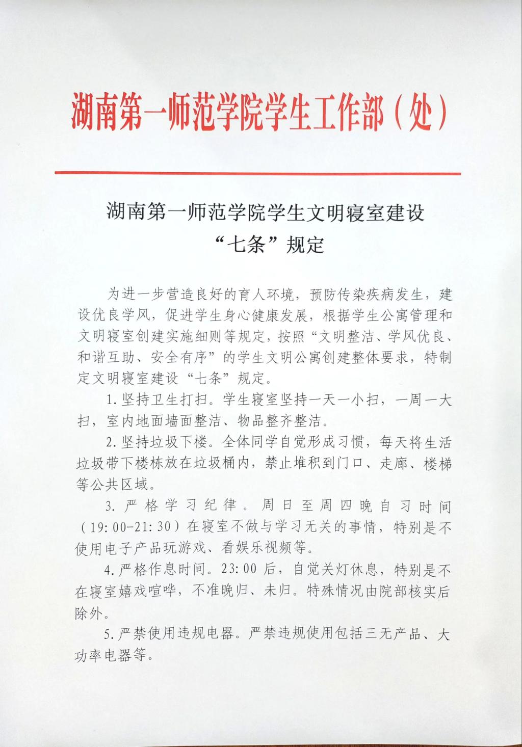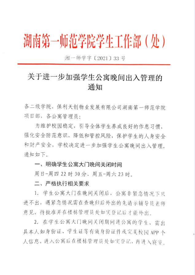 2021年11月13日,印发《BETVLCTOR伟德在线“六进公寓”实施办法》(湘一师校字〔2021〕100号),严格落实“六进公寓”各项要求。
