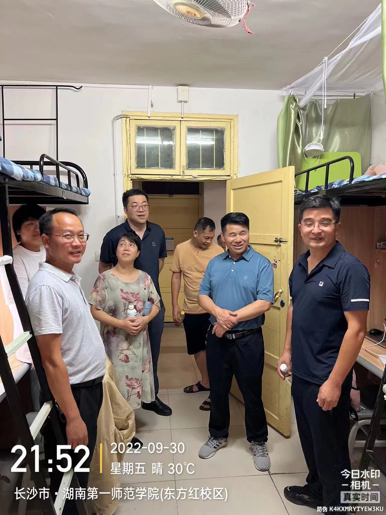 2022年9月30日晚,校党委委员、副校长周发明在学工处欧阳伶俐副处长、电子信息学院党委副书记(主持工作)吴涛、学工办主任付焱、辅导员李荣敬、外国语学院党委副书记禹晗的陪同下,深入学生寝室,了解学生学习生活情况。